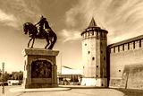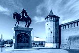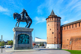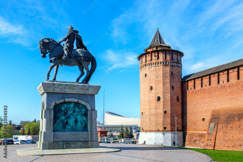 Dmitry Donskoy monument and mediaeval ancient Kremlin wall with tower in Kolomna, Moscow region against blue sky. Summer sunny day. Kolomna is ancient town in Russia