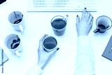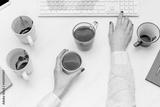 Office work concept, desk with coffee cups and other office attributed, woman working at the computer, female hands, top view, flat lay