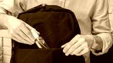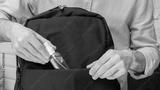 Man puts sanitizer or antiseptic, in a backpack, male hands, cropped image, close-up