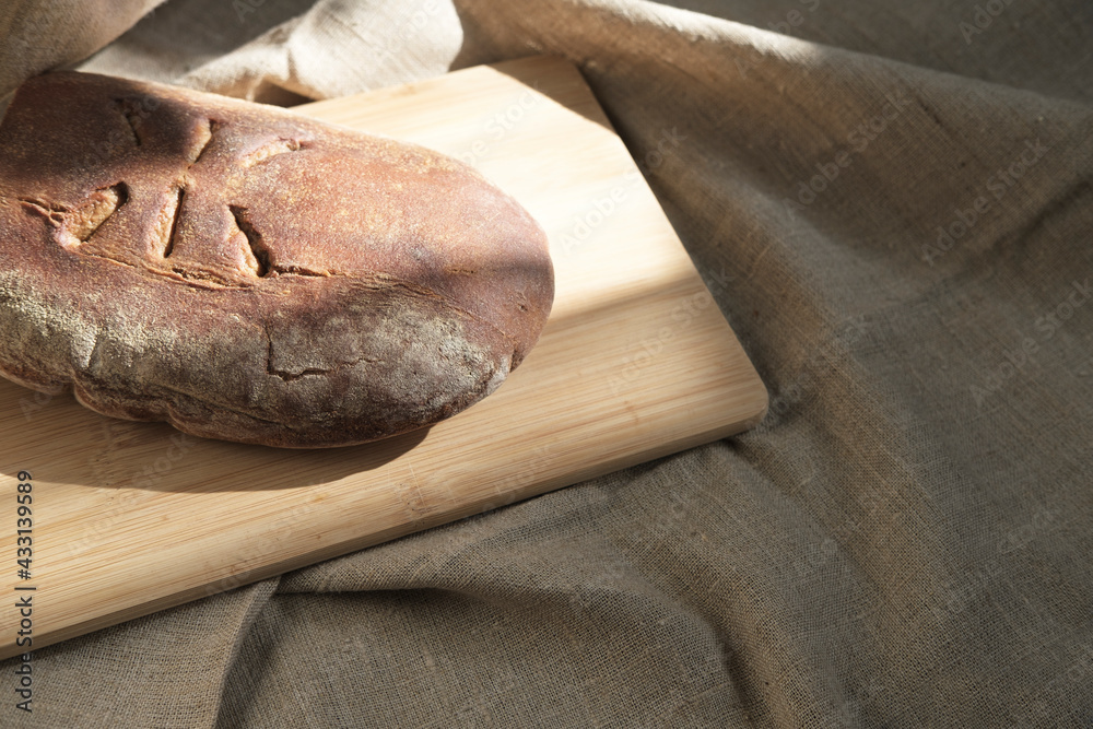 Freshly baked brown rye bread lies on a bamboo board on a canvas cloth in the falling natural light of the sun and in the shade. Cooking at home
