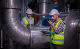Industry engineer under checking industry cooling tower air conditioner is water cooling tower air chiller HVAC of large industrial building to control air system.
