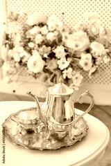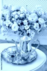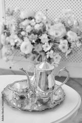 Coffee table decorated with flowers. Silver teapot on a tray. Classic interior
