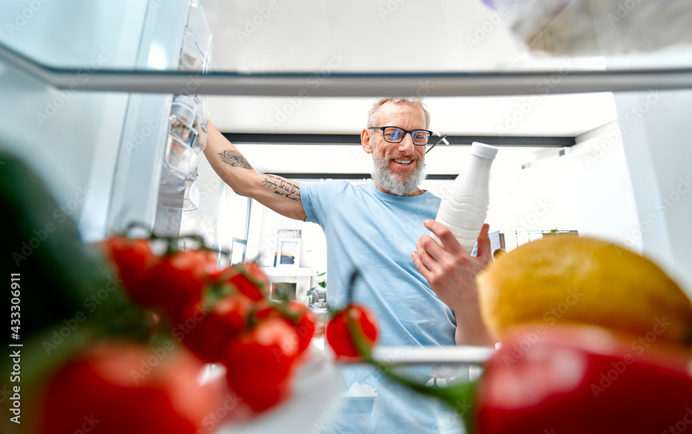 A mature man opened the refrigerator to cook or eat something. View from the refrigerator. Healthy food concept.