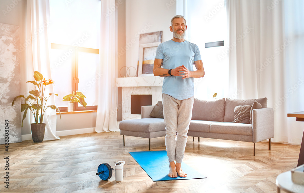 Sport, fitness and healthy lifestyle concept. Mature man doing exercises at home. How to stay healthy on quarantine concept.