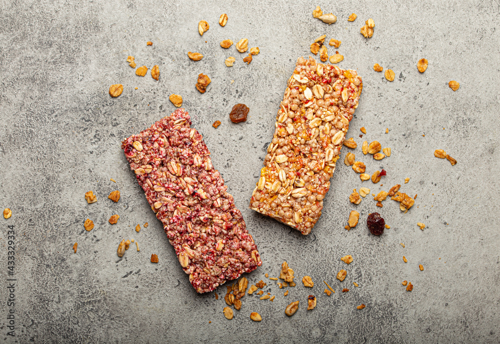 Assorted healthy cereal granola bars with nuts, seeds, fruit and berries on grey stone background, quick and healthy snack or sweet granola breakfast bars rich in energy and fiber