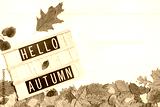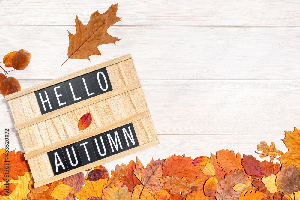Hello Autumn. Wooden message board with the text phrase Hello Autumn and dry fallen leaves on a white background. Autumn season, harvest time, leaffall, fall concept. Top view, copy space.