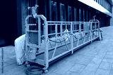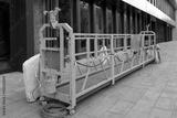 Suspended construction cradle after glazing the facade of a commercial object stands on the ground. Engineering urban background