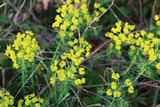 Cypress spurge yellow flowers in the meadow. Euphorbia cyparissias plant in bloom