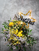Bouquet of flowers and star with text "Best Dad" on dark blurred background. gift for dad, men. Father's day festive concept. top view