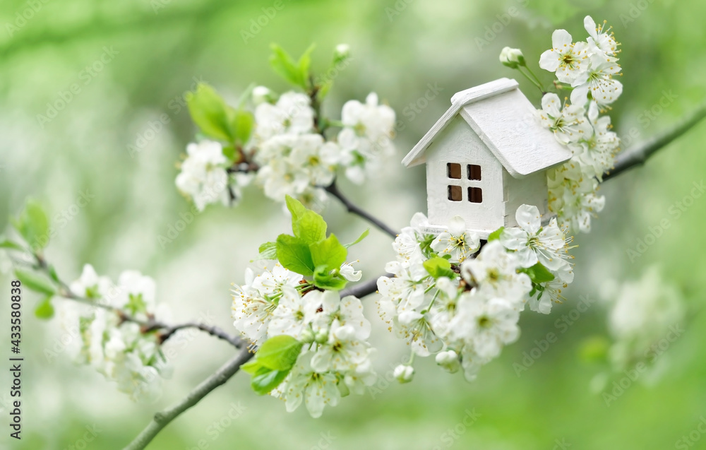 cherry flowers and toy house. spring natural background. concept of mortgage, construction, rental, family and property.