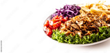 Yummy Turkish chicken kebab prepared and servend on the white plate with lovely homegrown vegetables and salty french fries.