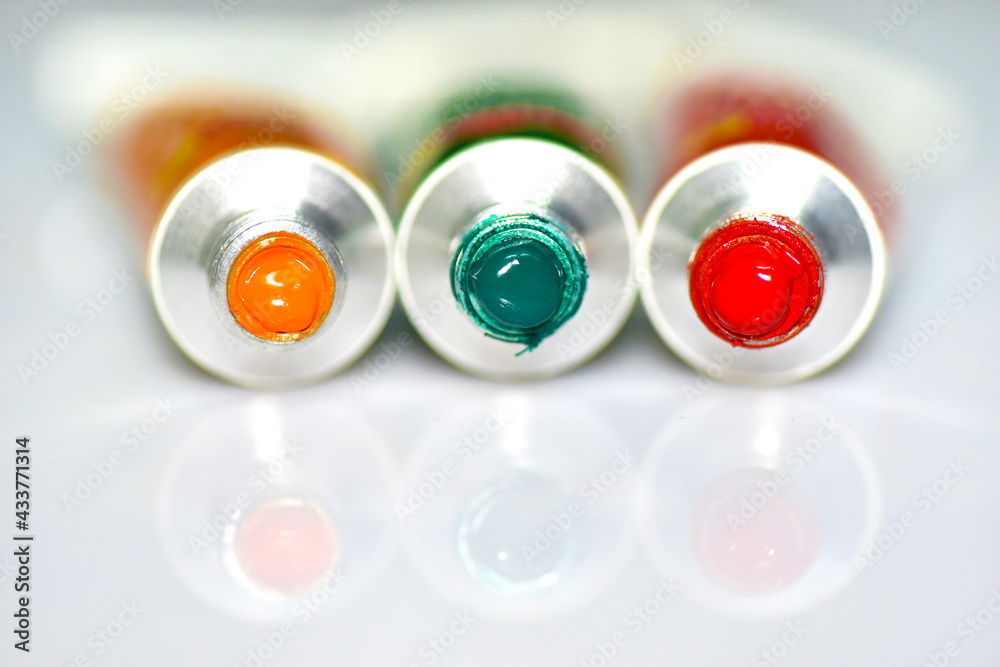Open acrylic paint tubes on white background.