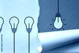 Drawings of non-burning light bulbs and one burning light bulb. A symbol of the lack of ideas and the sudden emergence of a creative idea