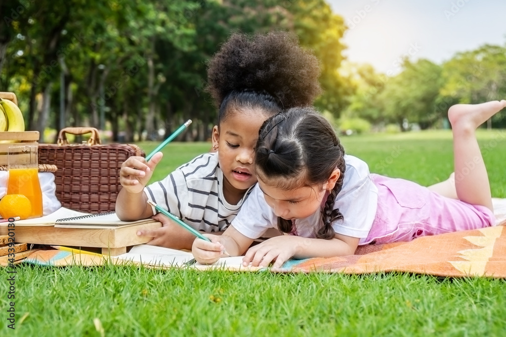 Two american african little girl lying and drawing with colored pencils at summer park, feel happiness, outdoor education concepts