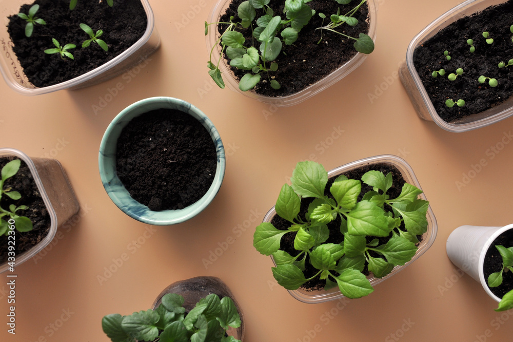 Small sprouts in pots, preparing plants for transplanting into the garden, growing seedlings