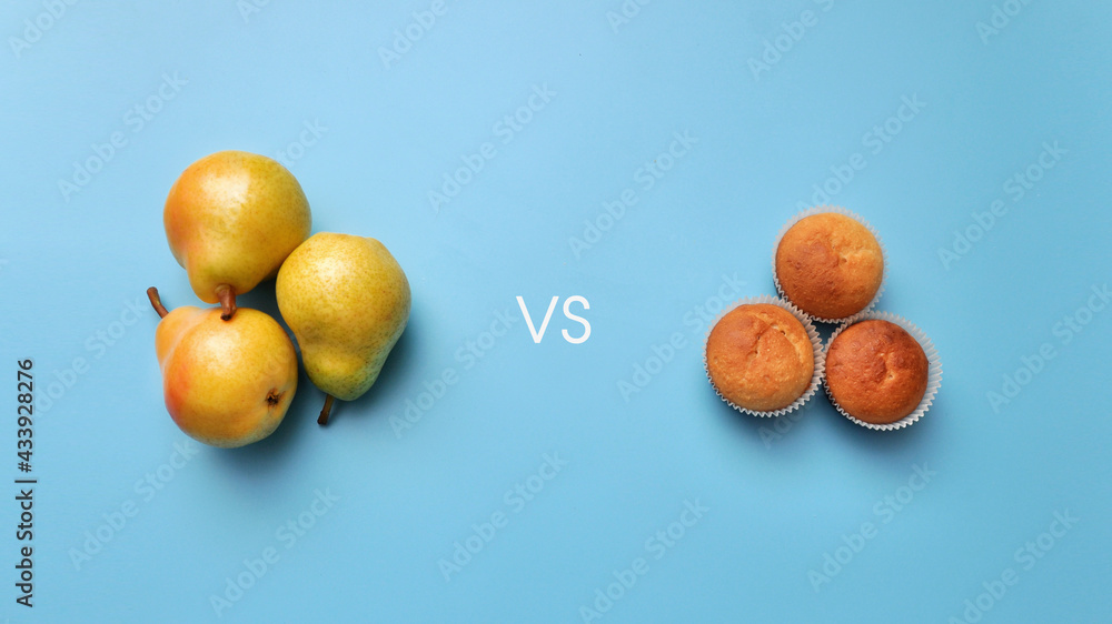 A person's choice of food: fruits or sweets. Choosing between healthy and unhealthy food