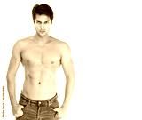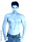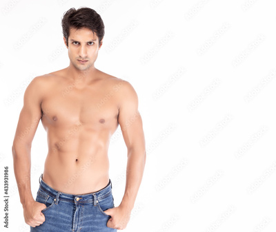 Portrait shirtless strong athletic young man showing torso six pack abs, studio shot isolated on white background copy space Handsome guy wear blue jeans He look aggressive Sporty guy get good health