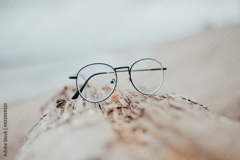 Womens beautiful glasses lie on a narrow beam on the beach on a blurred background