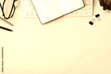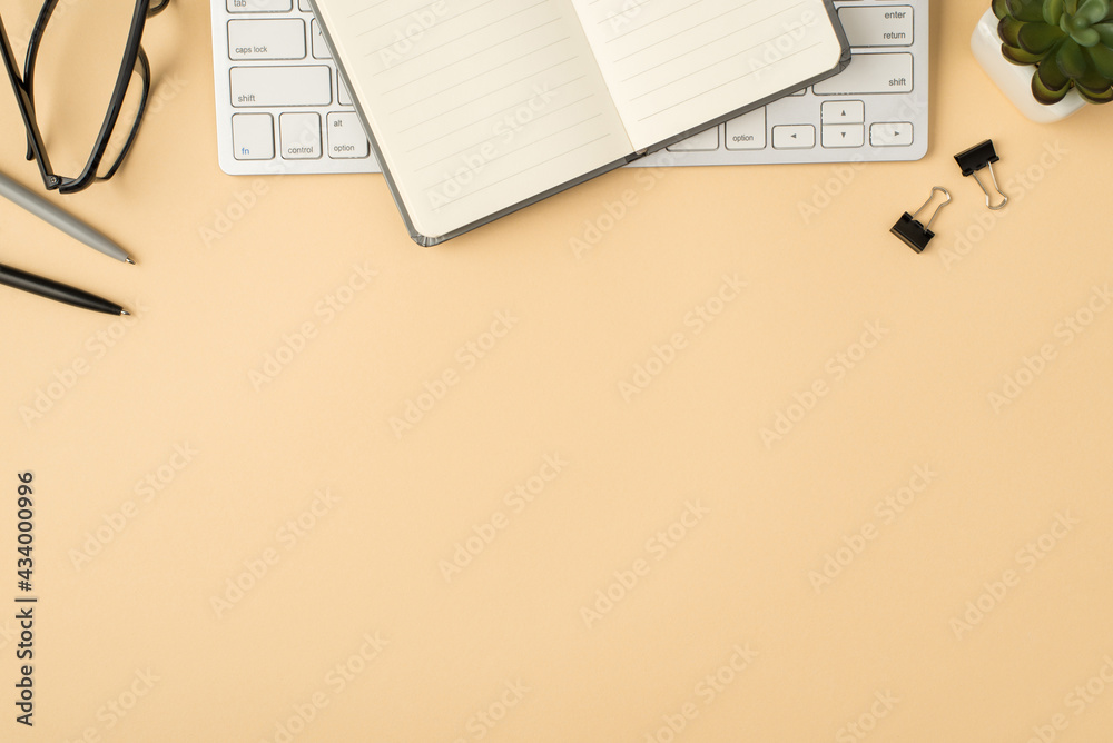 Top view photo of open grey reminder on white keyboard plant glasses pens and binders on isolated beige background with copyspace