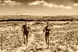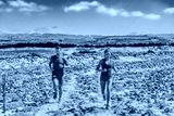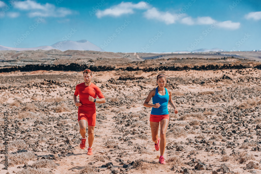 Sport athletes runners trail running training endurance in desert summer landscape. Man runner wearing compression sportswear. Fitness exercise workout fit Asian woman training for triathlon.