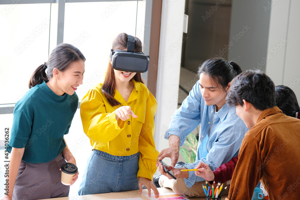 VR mobile phone application test, Asian woman with virtual reality glasses headset in VR experience, Asia business team developers for reality simulator smartphone app test at creative office, ui