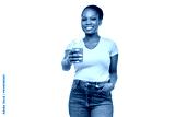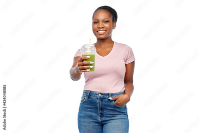 diet, healthy eating and detox concept - happy smiling young african american woman drinking green vegetable juice or smoothie from plastic cup with paper straw over white background