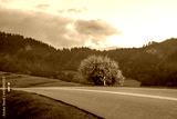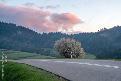 An asphalt road in the mountains during a beautiful, foggy and sunny morning
