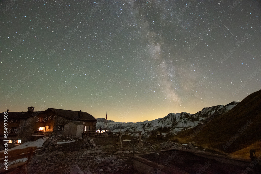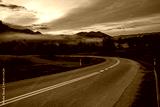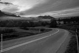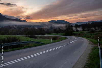 An asphalt road in the mountains during a beautiful, foggy and sunny morning