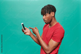 Young Black Man with mobile phone Wearing a red t-shirt Over A Turquoise Background