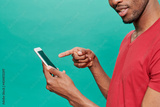 Young Black Man with mobile phone Wearing a red t-shirt Over A Turquoise Background