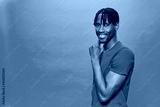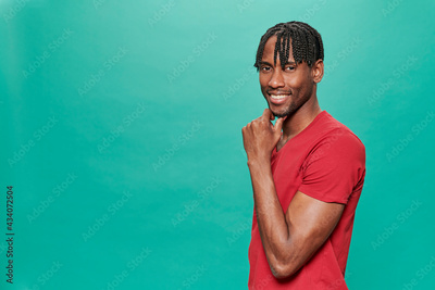 Young Black Wearing a red t-shirt Over A Turquoise Background