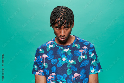 Young Black Wearing a printed t-shirt Over A Turquoise Background
