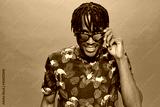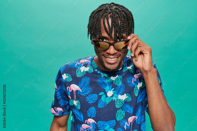 Young Black Wearing a blue t-shirt And Sunglasses Over A Turquoise Background