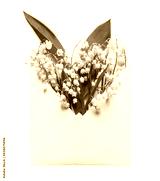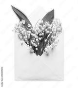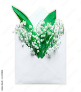 Creative layout made with Bouquet of lilies of the valley in an envelope flowers on white background. Flat lay. Spring summer minimal concept