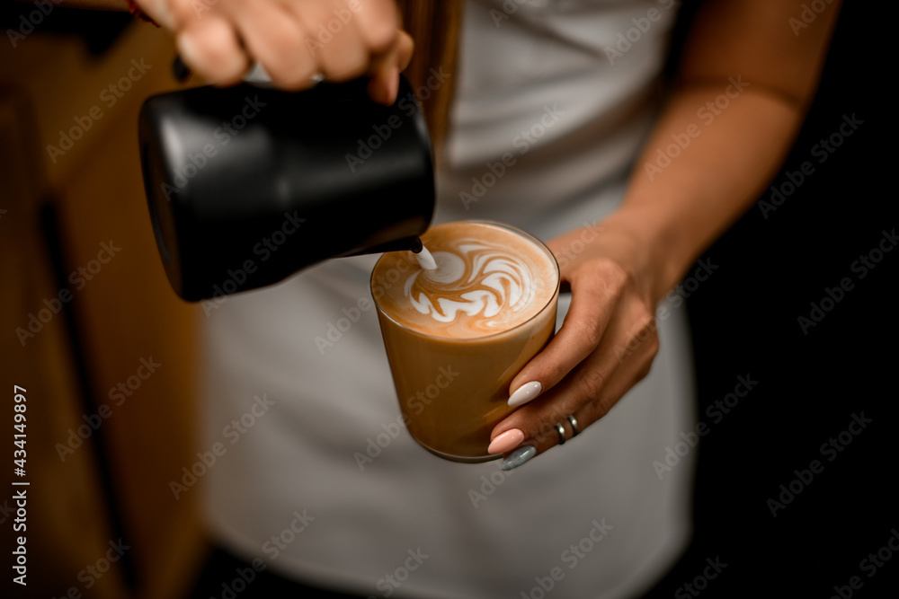 close-up of beautiful glass with coffee in woman's hand into which milk poured from jug