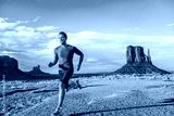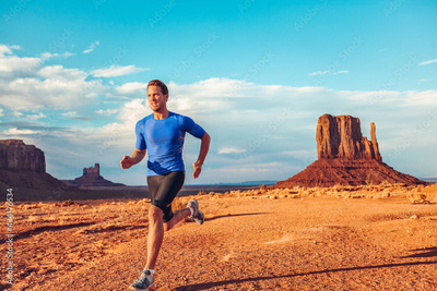 Fitness athlete runner man sprinting ultra running across desert landscape scenery on run trail marathon competition outdoors. Endurance long distance training. Monument valley, USA.