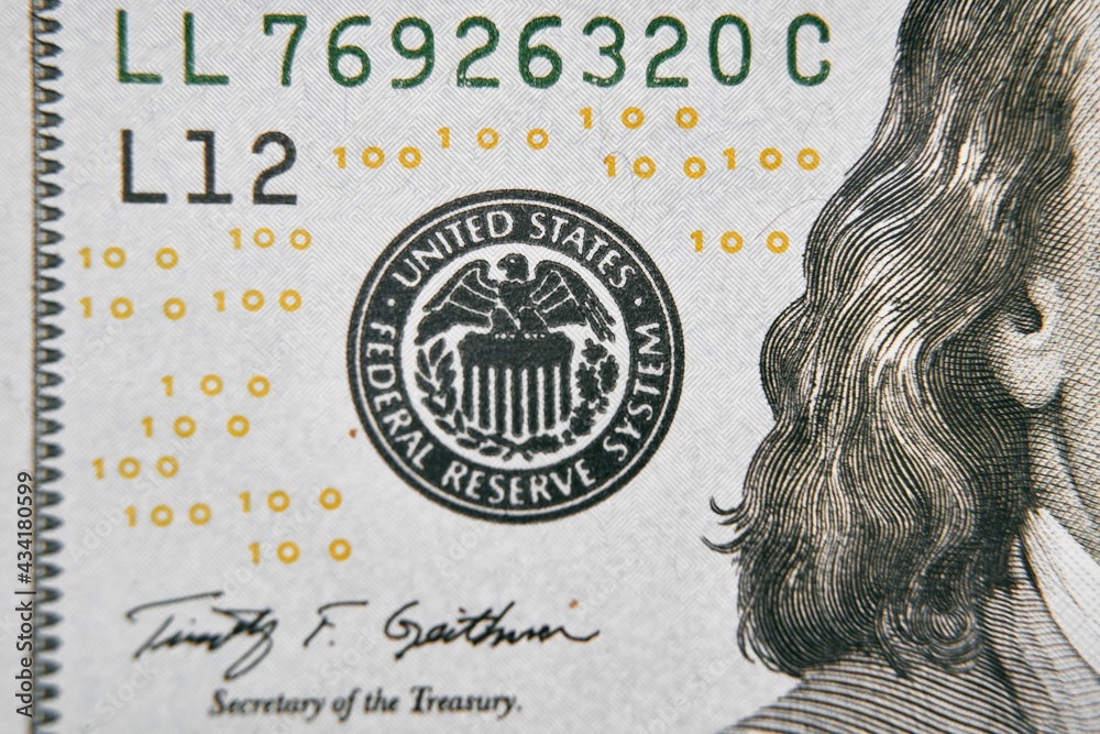 macro photo of federal reserve system symbol on one hundred dollar bill. shallow focus. close-up with fine and sharp texture