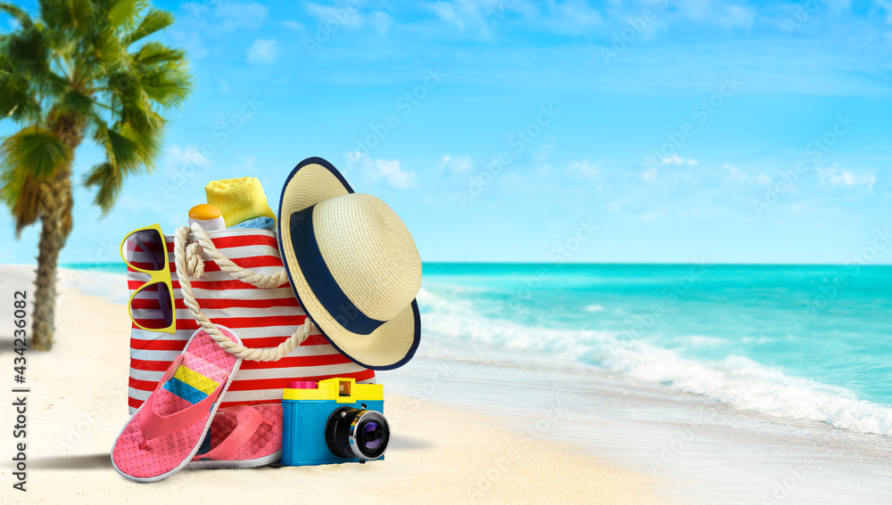 Summer beach bag and accessories - straw hat, flip flops and sunglasses on sandy beach and azure sea on background