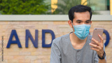 Man wear surgical mask protect covid19 and using smartphone outdoor