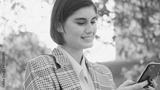 Portrait of attractive smiling businesswoman working on smartpho