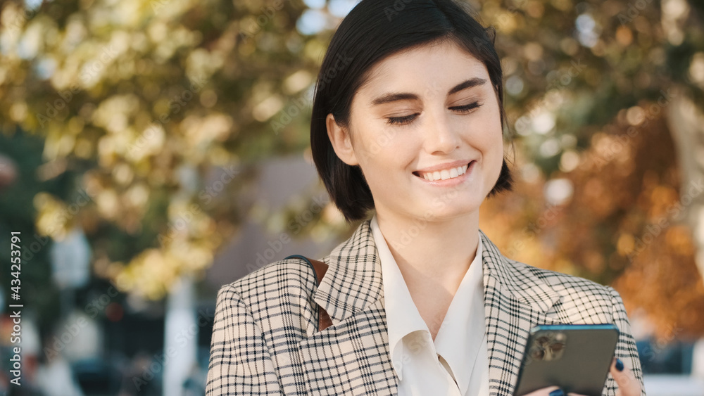 Beautiful businesswoman dressed in plaid blaizer looking happy u