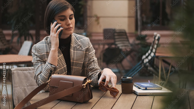 Young businesswoman sitting in cafe outdoor and talking on phone