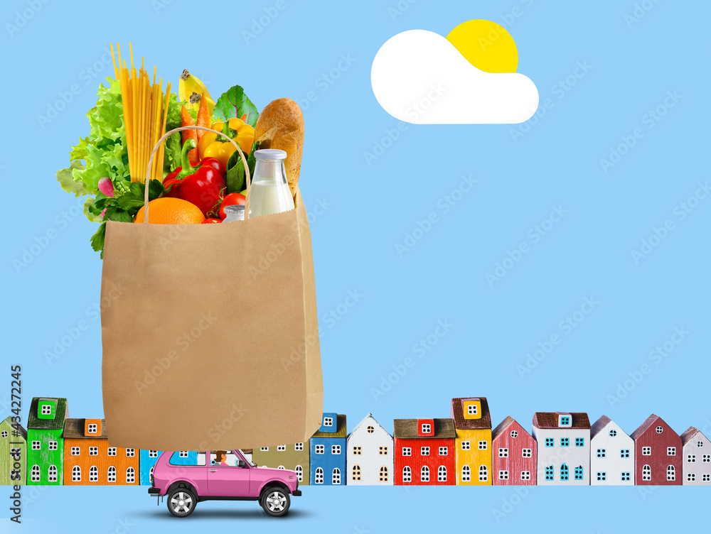 Pink car with shopping paper bag with groceries on the roof on city background