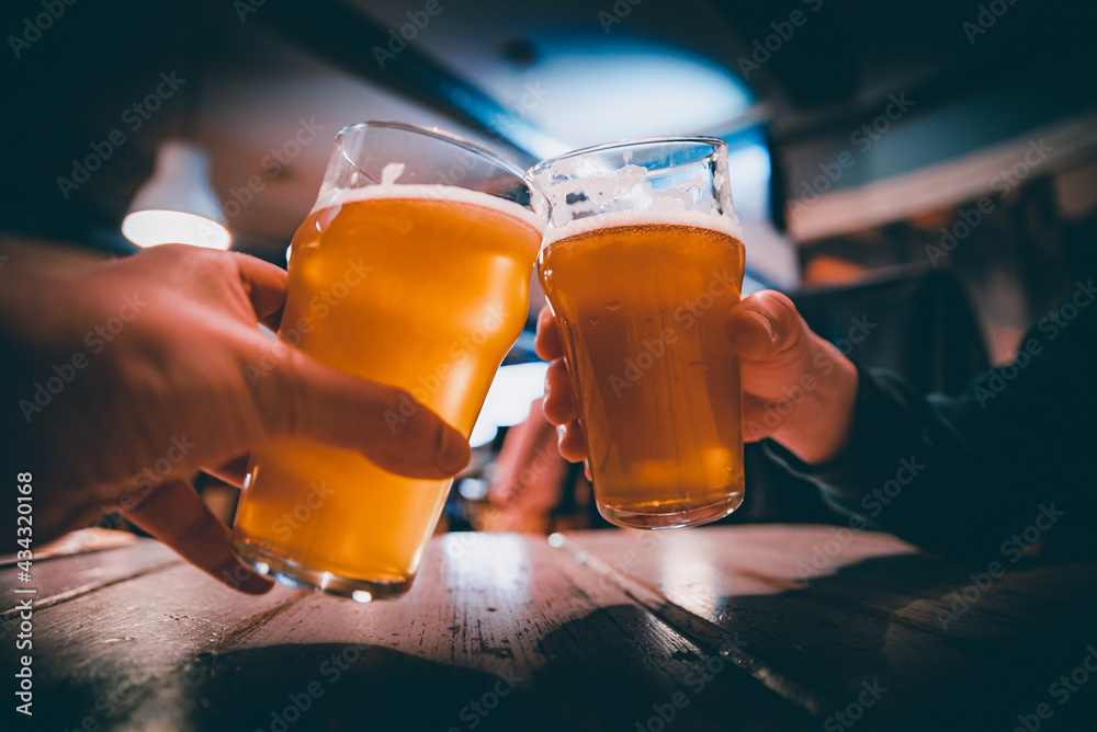 Closeup view of a two glass of beer in hand. Beer glasses clinking in bar or pub
