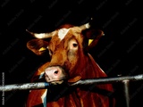 Simmental cow in a barn on black background
