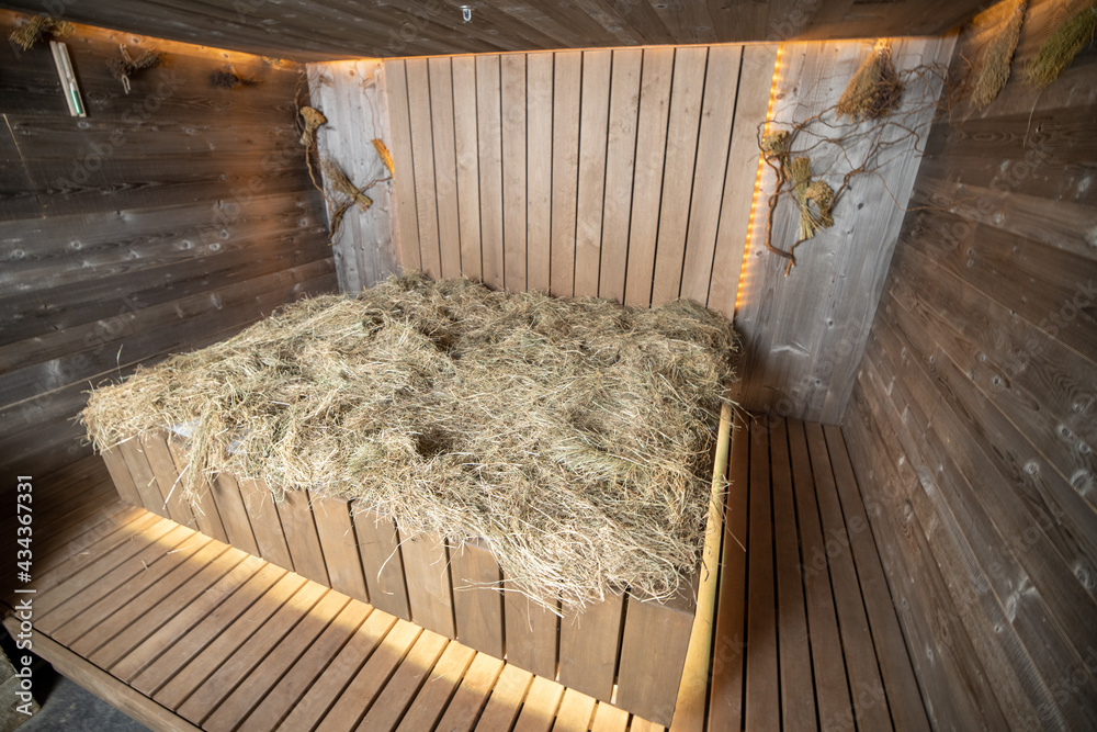 Interior of a wooden sauna, steam room, bathhouse with hay on wooden bench.