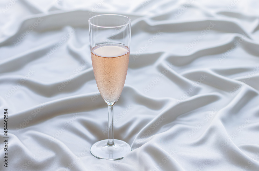 A glass of Rose wine on wavy satin cloth. Stay home concept.
