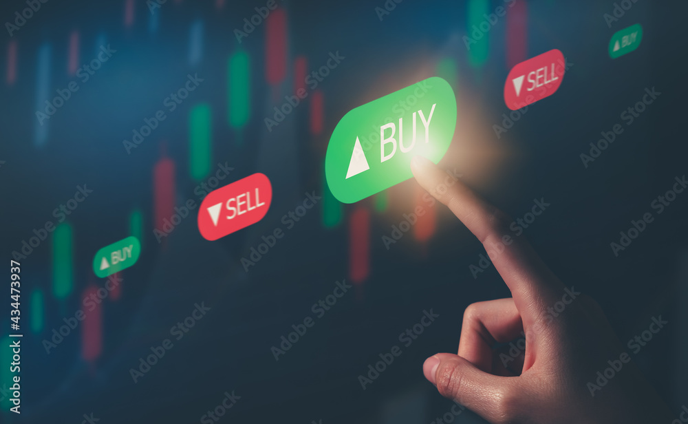 Stock exchange market concept, hand touching on trading icon screen with graphs analysis candle line on bokeh colors light.