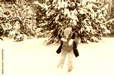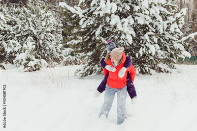 mother Carrying daughter Piggyback Having Fun In Winter Forest