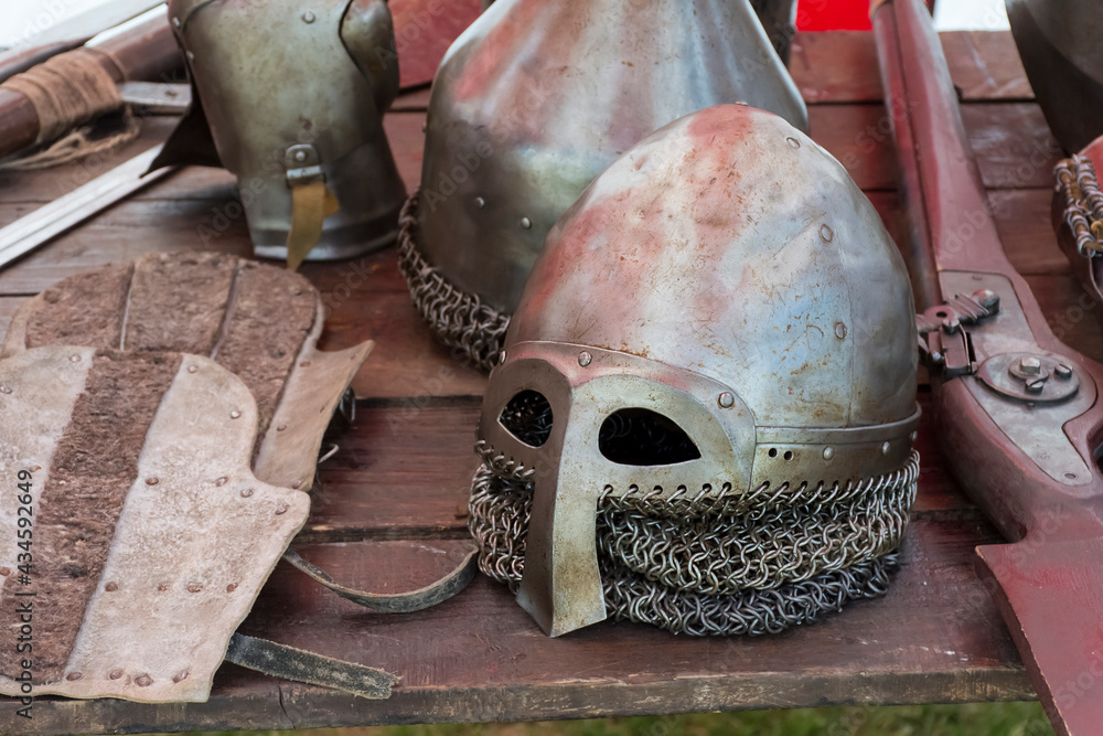 an old knight's helmet with scratches and dents lies on a wooden table.